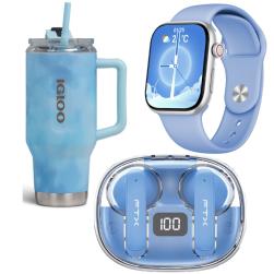 COMBO SMARTWATCH FTX AZUL + AURICULAR CON MICROFONO FTX AZUL + VASO TERMICO CON PAJITA AZUL